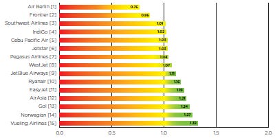 The numbers predicted the decline of Air Berlin (defunct), and success of Vueling (now in IAG), and the success of Norwegian before the cocky aggressively-pursued over-expansion that made it too indebted (so this chart is intentionally dated).