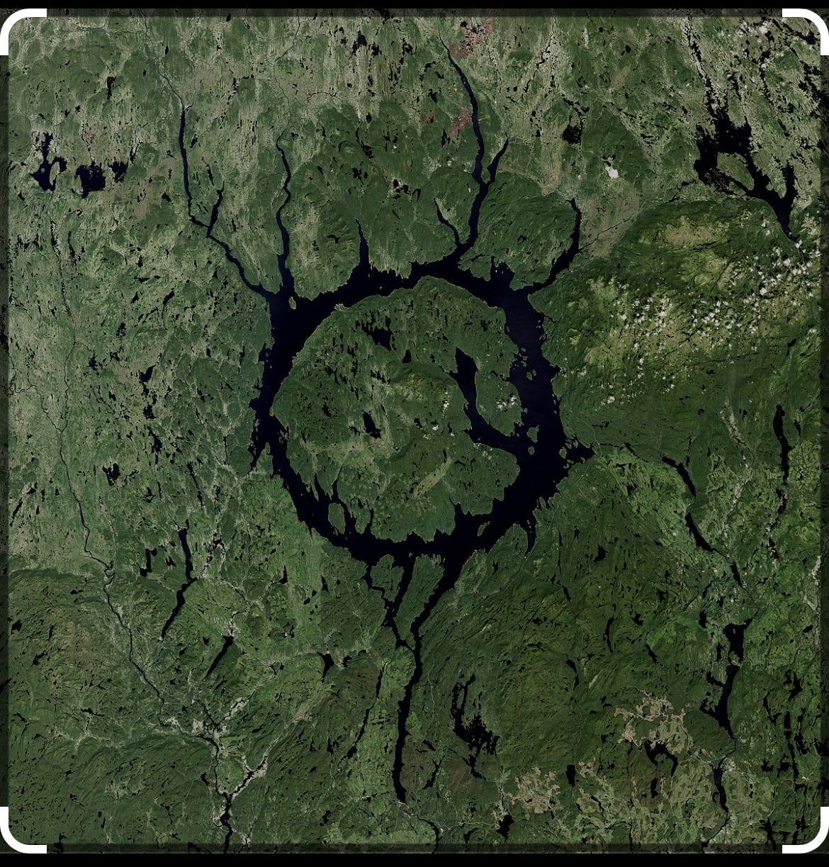 The “Eye of Québec” is a cool colloquial name for Lac Manicouagan in North-East Québec. It is an annular lake, created by a meteor 214m years ago that transformed into an island in the middle of this lake with an elevation of 342 to 359 meters. It has a lengthy shore line of 1922 kms and covers 1,942 sq.kms. This island with a diameter of 100 km is called Île Réné-Lavasseur which surrounding rivers allowed the construction of the mighty Daniel-Johnson dam. This provides spiky hydroelectric power for Quebecers and beyond.